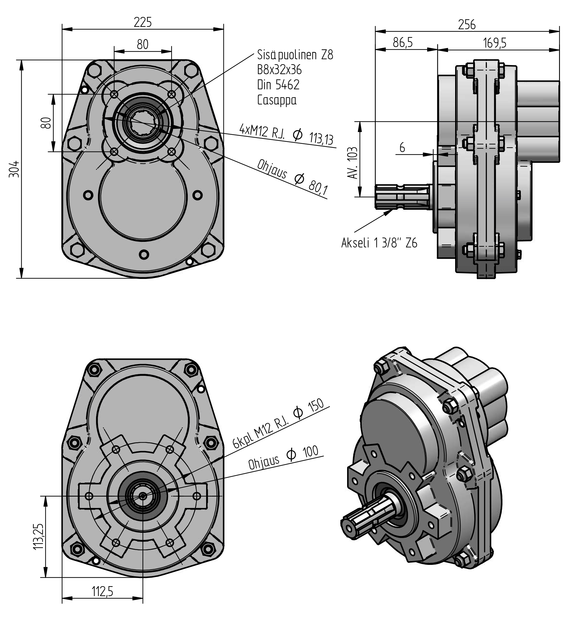 | Vaihteen kiinnitys | Kruunu 6xM12, ohj. 100mm reikäjako ø150mm |
