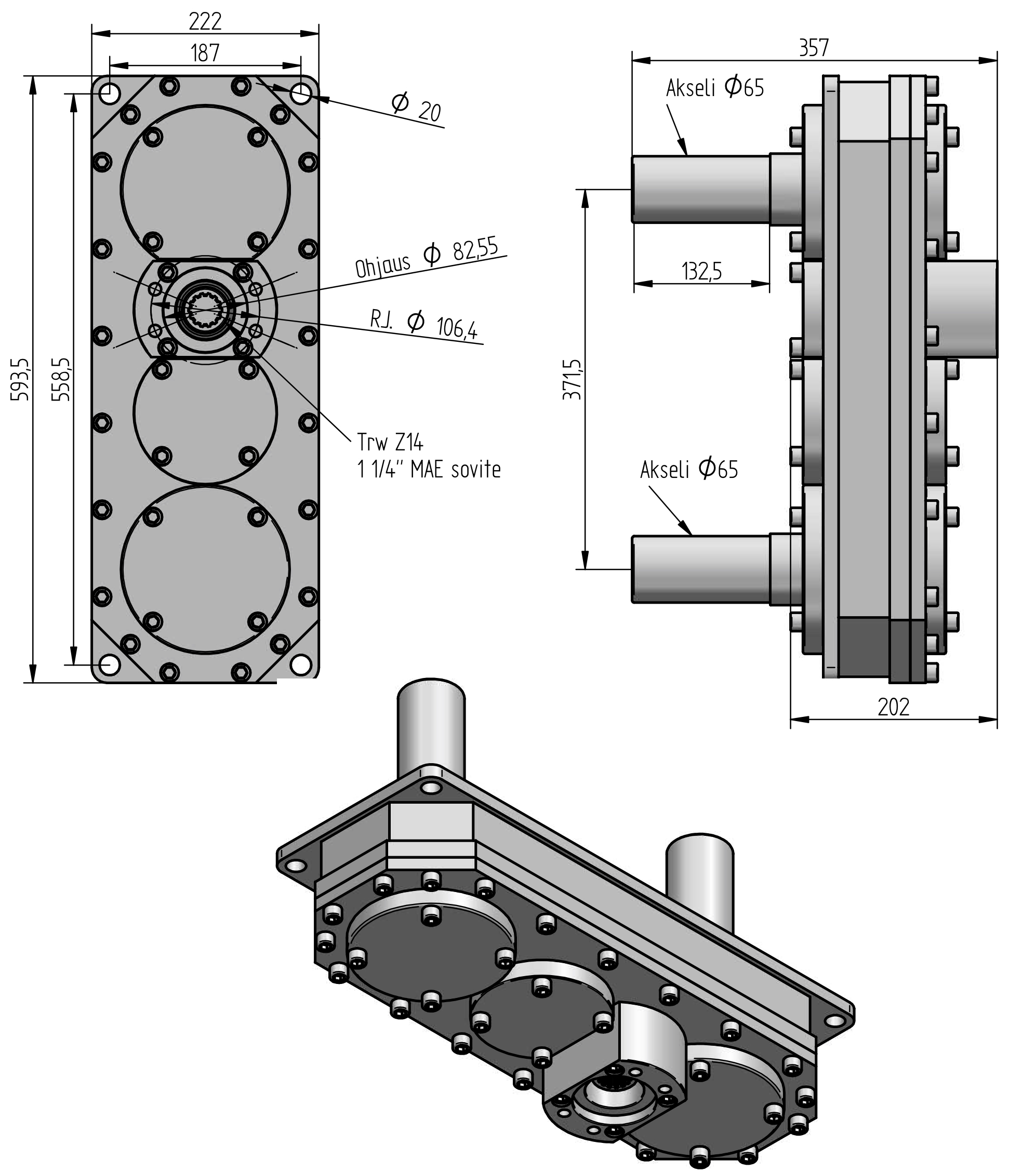 Kuvan vaihde on 65mm kiila-akselilla sekä hydraulimoottorin sovituksella.