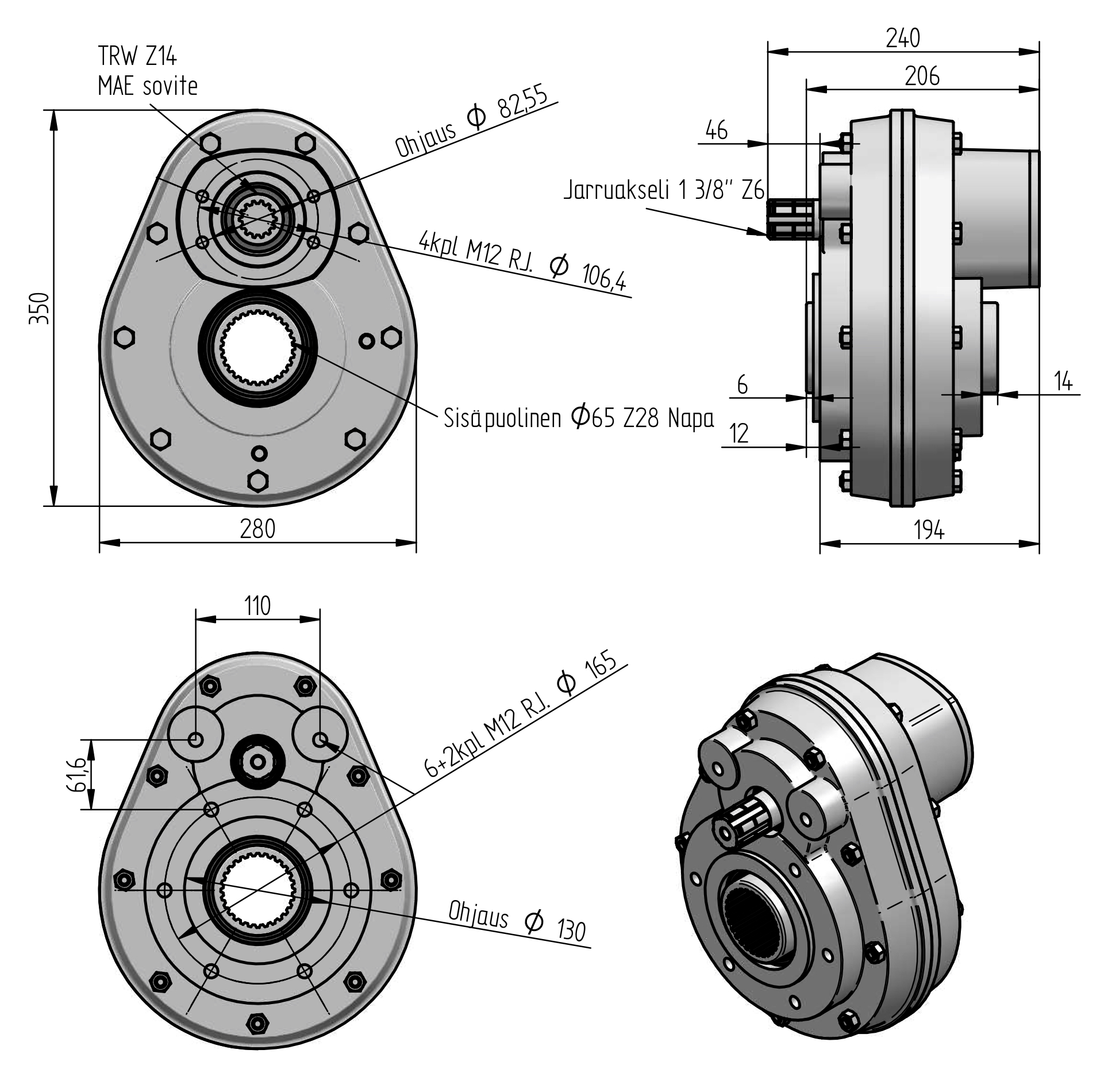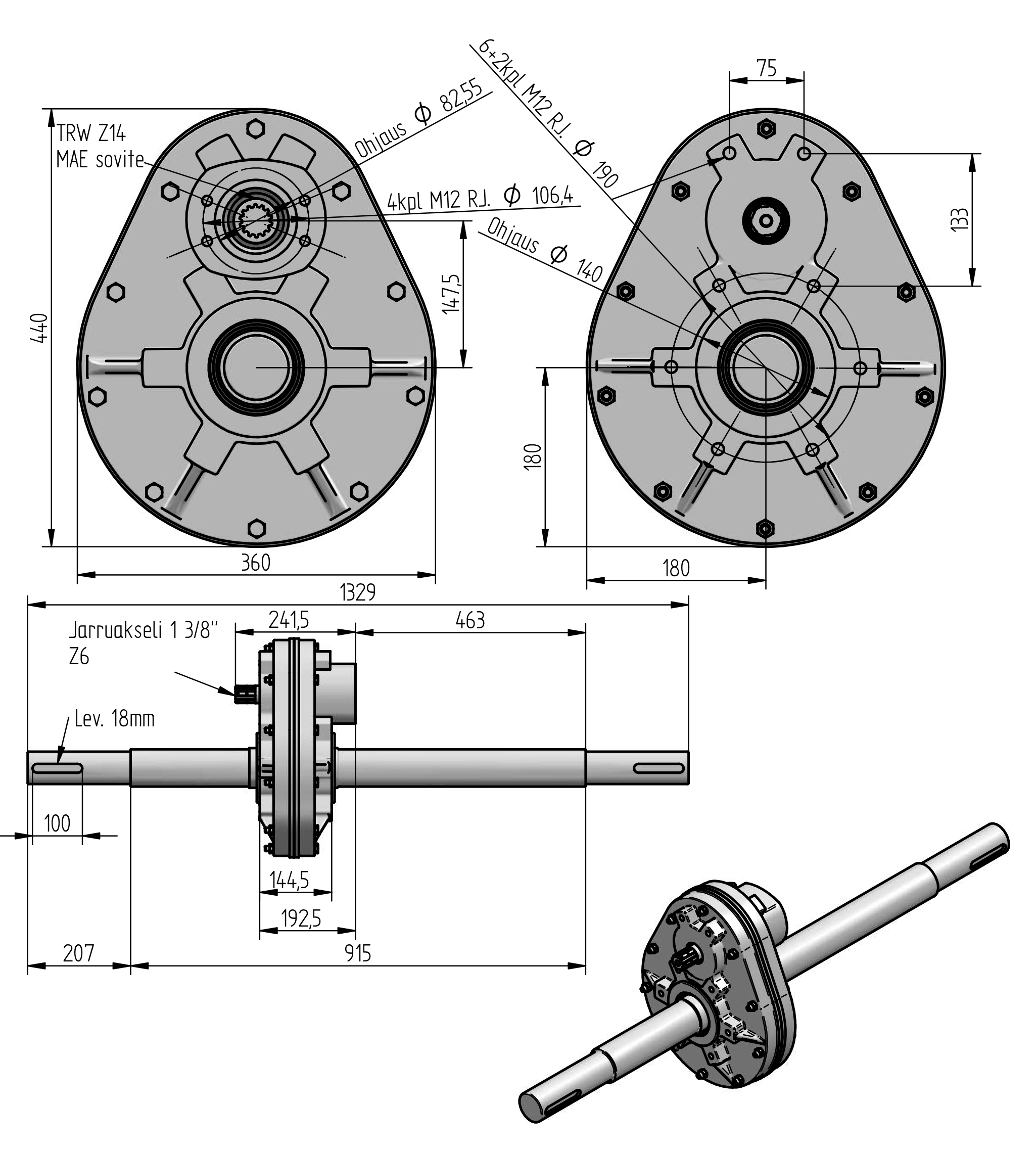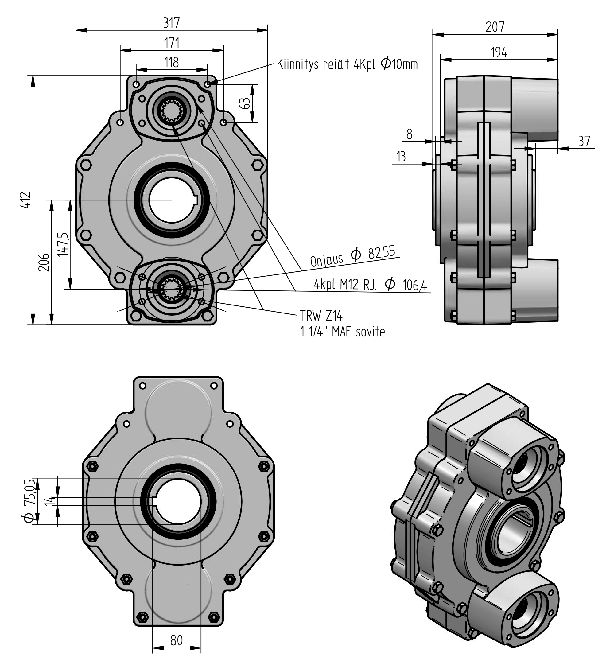 Kahdelle hydraulimoottorille, toisoakseli 75mm napa
